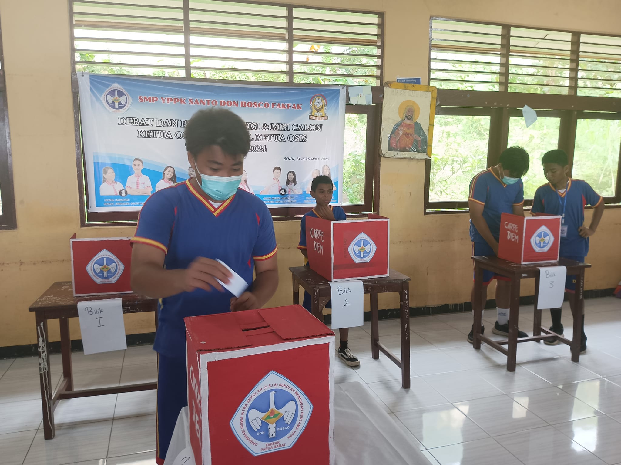 SMP YPPK donbosco Fakfak, melaksanakan project P5 yang merupakan salah satu komponen dalam kurikulum merdeka belajar, yaitu dengan melakukan pemilihan ketua dan wakil ketua OSIS dengan sistem pemilihan umum yang berlaku di Indonesia.