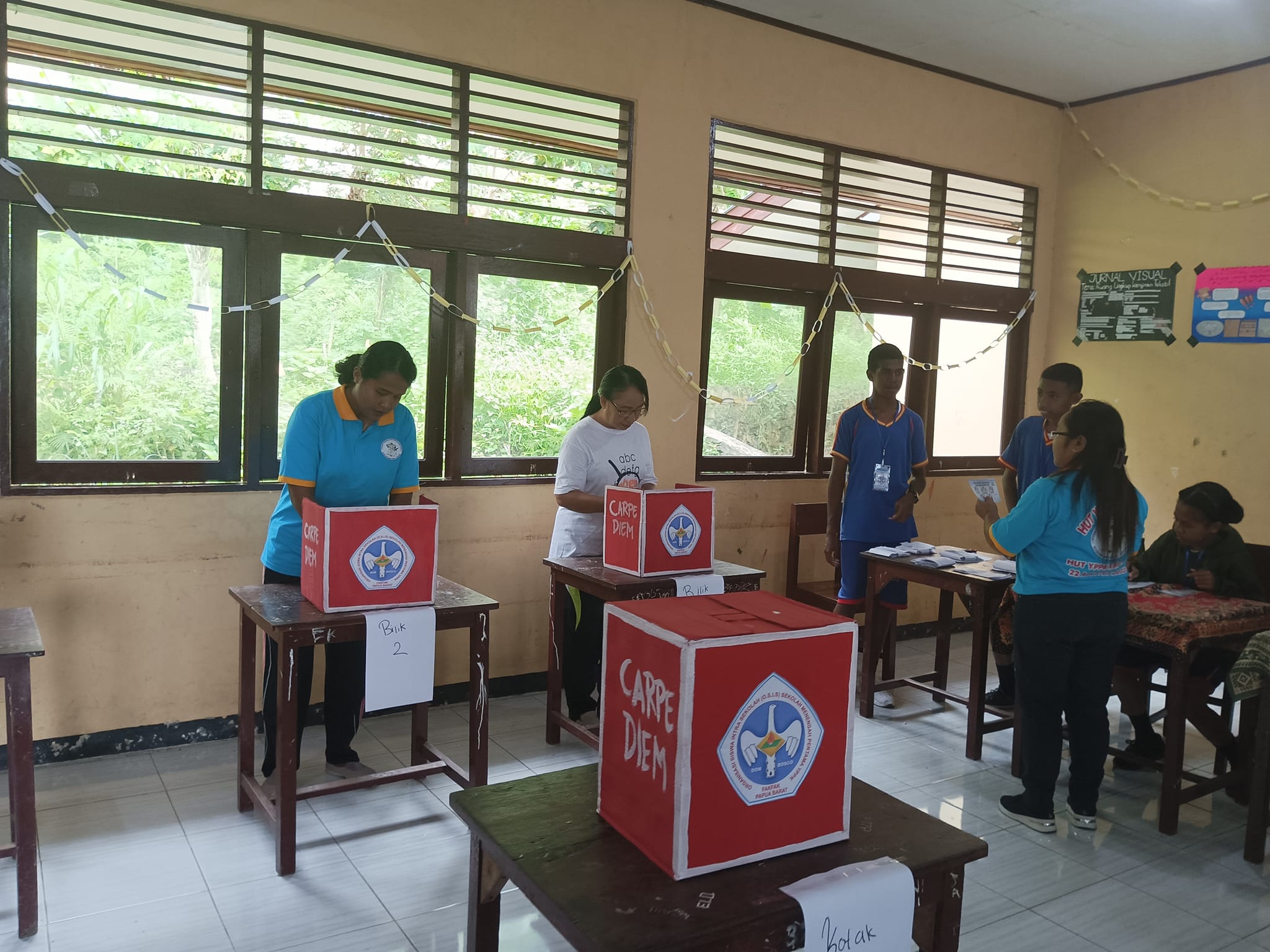 Belajar menanamkan nilai-nilai kejujuran dan Adil dalam berdemokrasi pada peserta didik dengan mengikuti semua tahapan-tahapan dalam Proses Pemilihan Umum demikan yang disampaikan oleh bapak Burhar Sawek, S.Pd selaku urusan HUMAS SMP YPPK Santo Donbosco Fakfak